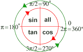 A good way to remember this is the phrase clockwise ACTS. Clockwise gives the direction from the first quadrant is clockwise and each letter from the word ACTS stands for a trigonometric function: All, Cos, Tan and Sin. The direction of the angle increases in an anti-clockwise sense.