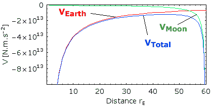 Gravitational potential is always negative indicating that the field does work in moving an object closer. The figure below shows the gravitational potential for the Earth and moon. The potential fields add together algebraically. We can see that to send a rocket to the moon we need only provide the force for the rocket to escape the Earths gravitational potential field and enter the moon's gravitational potential field. After this the rocket will accelerate towards the moon by the pull of the moon's potential.