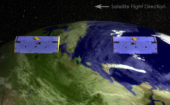 The variation in the Earth's gravitational field is measured continuously and accurately by the Gravitational Recovery And Climate Experiment (GRACE) satellites. These satellites follow each other in identical orbits but separated a short distance apart.