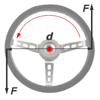 If two opposite moments act to cause an object to rotate, such as when your two hand are at the 'quarter-past-three' position on a car steering wheel, it is called a couple. The moment of a couple is called the torque. It is quite often said of engines and applys to the ability of the engine to turn the wheels, or wrongly by Jeremy Clarkson from 'Top Gear' as in, "This engine has a lot of torques."