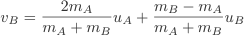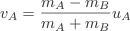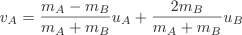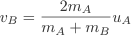 To calculate what happens when the masses are different we need to use a second equation. uA = vA+vB. This states that the incoming velocity is equal to the sum of the final velocities. Using this equation we obtain a general solutions for vA and vB.