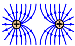 The second diagram above also shows a point exactly between two like charges where no field exists (since the forces on a charge placed there would be exactly equal and opposite in direction). Such a point is called a neutral point.